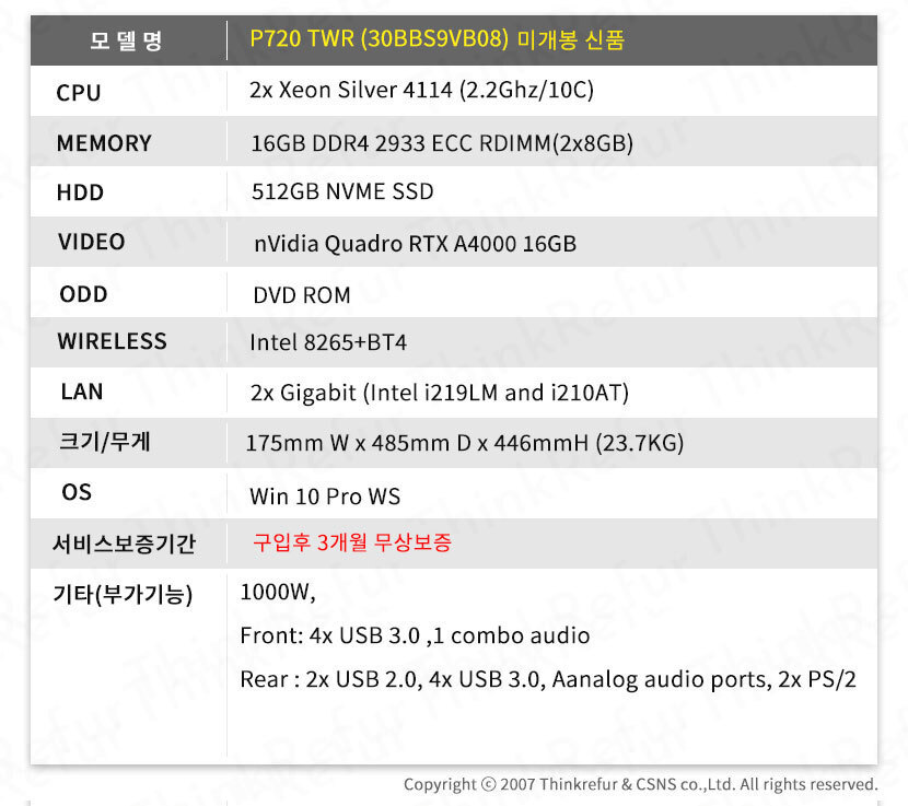> ThinkStation P720 30BBS9VB08 Xeon Silver4114x2°³ RTX A4000 ¹Ì°³ºÀ ½Åǰ